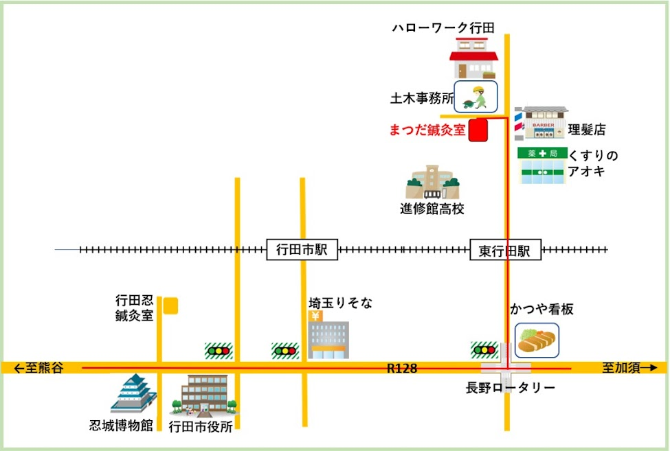 ・電車でお越しの際は、秩父線 東行田駅より徒歩10分ほど、ハローワーク行田の手前です。 ・お車でお越しの際は、熊谷方面より128号を長野ロータリーで左折し、"ハローワーク手前"にある土木事務所横の道路を左折後(クスリのアオキ対面に有り)すぐです。 ・敷地内に駐車スペースがございます。 |